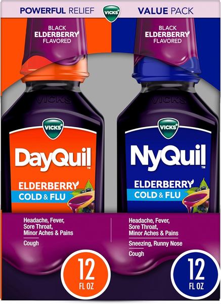 VICKS DayQuil & NyQuil Elderberry Flavor Cold & Flu Relief Co-Pack, Powerful Multi-Symptom Daytime and Nighttime Relief for Headache, Fever, Sore Throat, Minor Aches and Pains, and Cough, 2x12 FL OZ